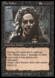 “No one quite knows how The Fallen are created, or who can become one. What little research that has been done has revealed that anyone practicing the arts of magic carries a grave risk of becoming one. Stories have been told of mages creating twisted experiments that turn on their masters. Some even say powerful sorcerers have the ability to turn others into The Fallen, removing their soul. By far, the most common explanation given is a phenomenon known as mana burn. Wizards draw mana from the land to fuel their spells, but it is said that they don`t always use it. Those who retain mana within themselves for a prolonged period of time are burned, and become something other than human, assuming they were human in the first place.”