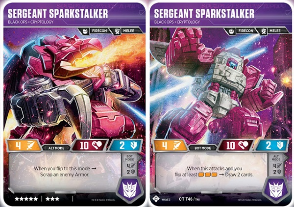 Leading the team is Sergeant Sparkstalker, and while his stats aren't overly beefy, he does boast a 4 attack and 2 defense in both modes so we don't have to worry about trading off when flipping for his abilities. And what abilities they are! Once you've got Sparkstalker in bot mode, he's going to be a somewhat consistent draw engine for our deck, since we're going to be leaning heavily on orange pips and having plenty of Bold on our Firecons. Flipping him back to alt mode also continues our disruption tactics by allowing us to scrap an armor off an enemy. The timing of these flips is going to be crucial to making sure our biggest hits get through.