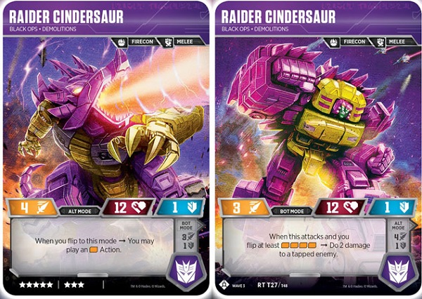 Backing up Sparkstalker is Raider Cindersaur. Once again, we're relying on a combination of a static bot mode ability and a solid ability on flipping to alt-mode to keep our flames burning. Again, with the amount of bold and the sheer number of orange pipped cards we'll be slinging, his direct damage ability is generally reliable. We'll also have enough worthwhile orange actions in our deck to make sure that flipping him back to alt-mode will give us a solid action advantage.