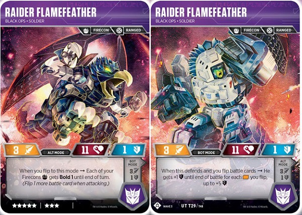 Rounding out the triad is Raider Flamefeather, who we will rely on for helping to activate our other Firecon's abilities as well as stand in the way early and take hits for us. Being able to add to his defense value for each orange pip flipped during combat means that we'll want to attack with Flamefeather out of the gate and help direct our enemies' attacks against him. This isn't going to save us in the long run, but our plan is to not let there be a long run. To that end, once Flamefeather has taken a hit or two for us, flipping him back to his alt-mode gives all of our Firecons extra Bold, which as stated, will lead toward more activations of Sparkstalker and Cindersaur's bot mode abilities.