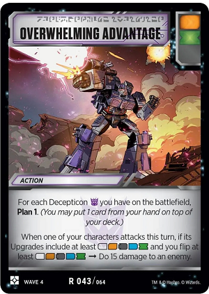 Bah-weep-Graaaaagnahwheepnini bong, gamers, and welcome back to another article about Transformers: TCG. Last week we had a look at the upcoming Wave 4 card that allows for an Autobot alternative win condition, Daring Escape. This week, we're going to take some time to examine the Decepticon rebuttal to that, Overwhelming Advantage. Both cards have the potential to swing a game massively when played, so today we're going to think about ways to pull off Overwhelming Advantage as often as we possibly can.