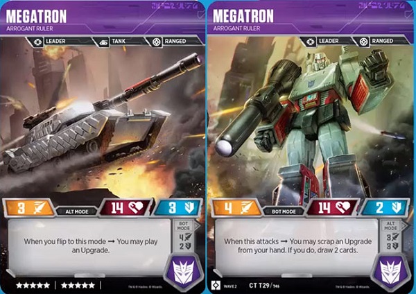 In order to play this out, we'll first have to assemble a crack team of Decepticons. My personal pick for leading the team is Megatron, Arrogant Ruler from Wave 2. He's not the beefiest or hardest hitting of the Megatron variants, but he does come with an ability that we're definitely going to want to rely on. When you flip him from Bot Mode to Alt Mode, he allows us to play an upgrade in addition to the normal upgrade play we would get for turn, thus speeding up our set-up time significantly.