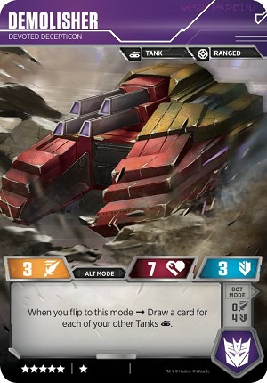 However, while we can pull off our trick with Megatron, he's not going to be the focus to start with. That honor is going to another tank, this time all the way from Wave 1. Demolisher, Devoted Decepticon actually has two very good abilities we're going utilize here. When flipping to alt-mode, he is a decent card draw engine, especially since we're going to be running 3 tanks on our team. What really excites us, however, is his bot-mode ability. Since the wording on his card simply states to flip extra battle cards equal to his defense value but does not specifically say that this is the same as Tough, it lets us get around pesky things like Stunticon Swagger and Acid Storm's abilities to shut down Tough. It also means that we're going to be able to flip a large number of cards when he attacks, almost single-handedly assuring us of the 5 distinct pips we need in order to activate Overwhelming Advantage.