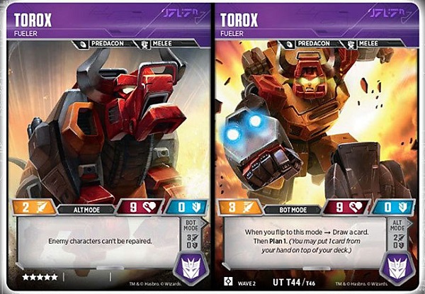 Rounding out our team, we're going back to the Decepticons to recruit the Predacon Torox - Fueller. He may not seem like much on the surface, especially in alt mode, but he does allow us to flip him early in the game to draw a card and possibly set up the top of our deck to make the most out of Leap of Faith or Anticipation Engine. He very likely won't live long with his meager 9 health and no defense, but with any luck, we really won't need him to.
