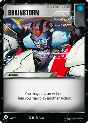 What we care about most from Brainstorm is the number of other combos and action chains we can spin off into. Of course, one of the best cards to chain into with Brainstorm is Leap of Faith if you have stars to spare in your deck. There's absolutely nothing more satisfying than laying down a Leap, scrapping that top card, and seeing Brainstorm smiling up at you. It's like Christmas come to Cybertron!