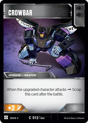 Ah, the good old trusty Crowbar, always good for opening boxes and crates, as well as opening up a world of hurt on your opponents. On the surface it's just a standard weapon upgrade that gives your bot a bonus to attack and scraps itself after battle, but given the overall lack of weapon upgrades that just give a static, unconditional boost to your attack power in the set, this one is a solid early pick. The double black pips for that extra pierce against blue-heavy drafters is also a very nice touch. The only downside to this card is that it does go away when you attack, though that trade-off is worth it for the bonuses this powerful card brings to your limited pool.
