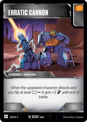 Where Crowbar is a solid upgrade with an unconditional +2 attack, Erratic Cannon comes with some caveats to its usage, but when it comes through, it packs a wallop. Given the pretty even spread of battle icons in this set, the probability of drafting a few whites into your Limited deck is high, so you'll find yourself more often than not being able to get the extra 3 attack. The orange pip that it sports isn't anything to ignore, either. When battling it out in a Limited format, every little bit of extra attack power you can bring to bear during your combat steps is worth consideration.