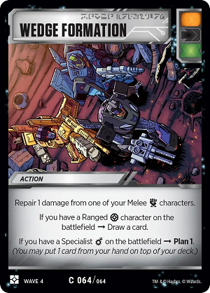 Last on my list, but probably should be first in your mind, is Wedge Formation. The sheer versatility of this card, and at a common rarity, is pretty nuts. Given the way most people's character draft pools end up, it isn't unheard of to have all three; Melee, Ranged, and Specialist; on a single team, and even if you have just one or two of them, this card is still heavy with value. The three battle icons it comes with are very strong, as well, giving you some guaranteed damage, as well as allowing you to pull it into your hand to play on your next turn. All in all, this card is beyond solid, and is a definite early pick in any draft, if for no other reason than to not see it played against you.