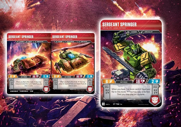 Rounding out the Autobot triple-changes is Sergeant Springer, who is simply a card-draw powerhouse. In either of his alt-modes, he can discard a single card to draw two, and since you're likely to have either upgrades or actions in your hand, you'll probably be able to get a good amount of use out of his abilities. In his bot-mode, all of those cards you've been drawing are going to be put to good use, allowing you to play both an extra upgrade and an extra action on your turn when you flip him. With the rate at which his other modes allow you to draw more cards, getting to the point of having enough to consistently play those extras is going to be easy as pie!