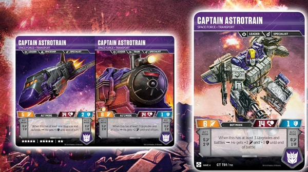 Where Apeface may be a bit of a wild-card, Captain Astrotrain is as reliable as a steam engine. In space. A space steam engine of destructive force whose abilities can as you play further into the game. He starts off getting a bonus to his defense for a single upgrade, probably a solid defensive booster, then moves to extra attack when he's added a weapon to his arsenal, and then into a full-on beast when fully decked out. Since he's a specialist moreover, there's an entire world of specialist specific upgrades to play with him, letting him get extra upgrade plays, draw extra cards and so on. Sadly, with the banning of Multi-Mission Gear, he can't get the extra actions, but there's still plenty of specialist equipment to get value out of.