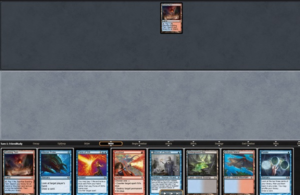 Here we are Game 2 against an interesting control deck. Our opponent is playing a Grixis shell but has included the Punishing Fire engine with Grove of the Burnwillows. This gives some interesting sideboard options but mainly it's a chance to use Dack Fayden. Both of us kept seven and our opponent has led off with Scalding Tarn, then passed. We have plenty of options available to us but I think there's really only one line here that fits the bills against our control deck.