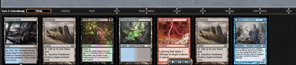 [showhide type="links4" more_text="My Play:" less_text="Hide Text" hidden="yes"] Leading off with Lightning Bolt mana here by fetching Volcanic Island and playing Delver is very appealing. It also gives you the option to turn two Bolt plus Wasteland if the opponent doesn't have a basic Forest in play. However I think leading off Underground Sea into Delver here opens us up more. While Lightning Bolt is very appealing I think Marsh Casualties as a Wrath of God is going to be more impactful. With plenty of draw spells left in the deck it will be easier to find a second colored source but having the option to fetch for the second Black source here is infinitely more appealing to me. [/showhide]