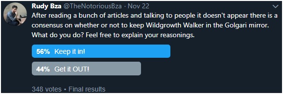 This poll was extremely close even after a few hundred votes. I think this goes to show how difficult sideboarding can be. To complicate matters further, Reid Duke said in his article to board Wildgrowth Walkers out and gave great reasons to do so, but Caleb Durward compared the card to Tarmogoyf in his call to leave them in. Personally I feel like the matchup centers around Find // Finality and Carnage Tyrant, so having a board presence and extra life to play with means you can't be eked out as easily and Wildgrowth Walker getting massive means it's a must kill target. My reasoning ALSO takes into account how other players are sideboarding. We can see many players lean on extra Tyrants and board out some number of Cast Down. Because of this I feel more comfortable leaning on a cheap creature that grows larger, is harder to remove, and demands an answer in the short term. It helps clear the way for planeswalkers and gives you more time to find the answers you need.