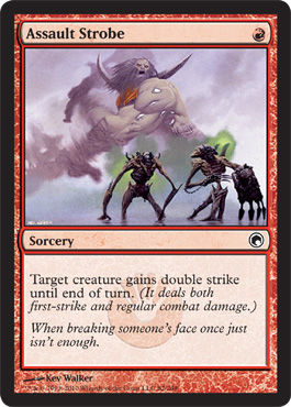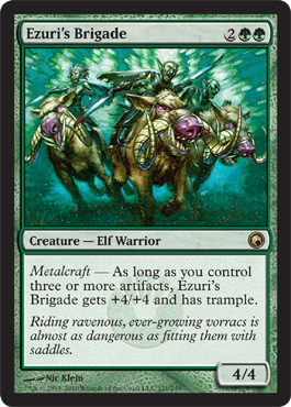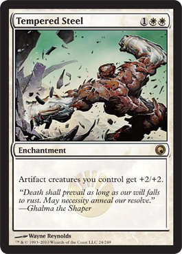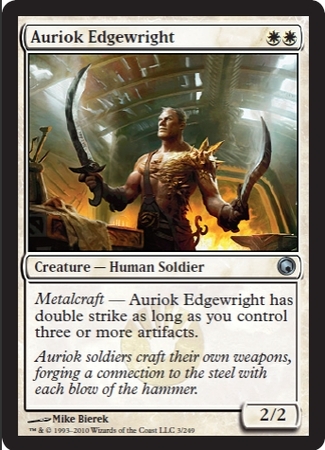 Metalcraft - Auriok Edgewright has double strike as long as you control three or more artifacts.
