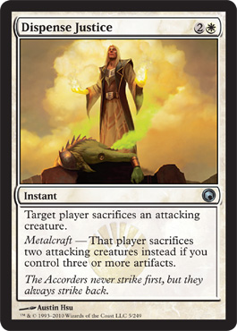 Metalcraft - That player sacrifices two attacking creatures instead if you control three or more artifacts.