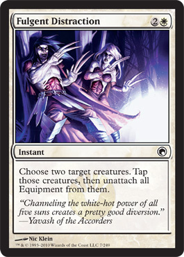 Choose two target creatures. Tap those creatures, then unattach all Equipment from them.