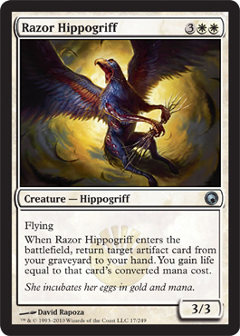 When Razor Hippogriff enters the battlefield, return target artifact card from your graveyard to your hand. You gain life equal to that of that card's converted mana cost.
