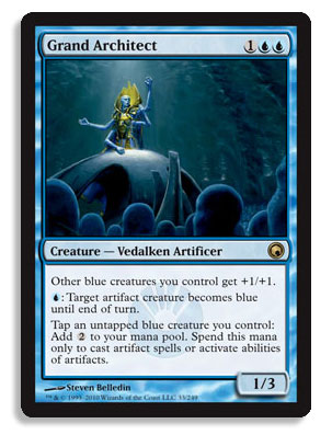 Metalcraft - Ghalma's Warden gets +2/+2 as long as you control three or more artifacts.