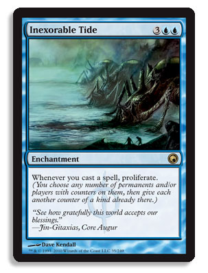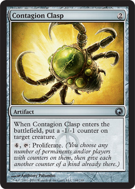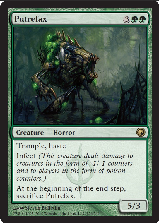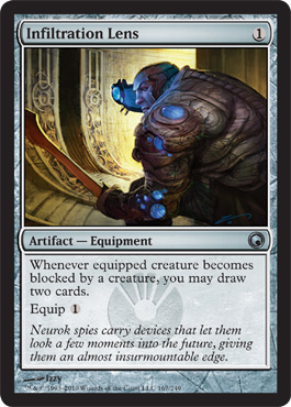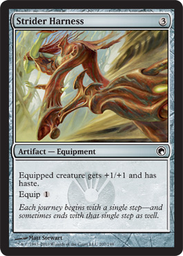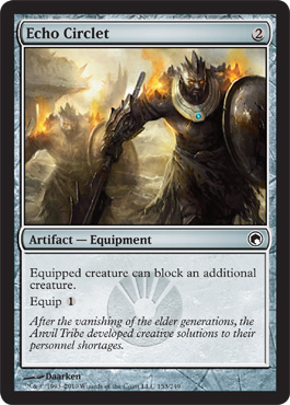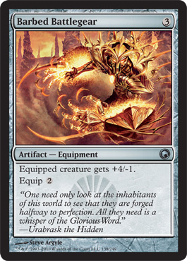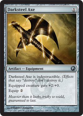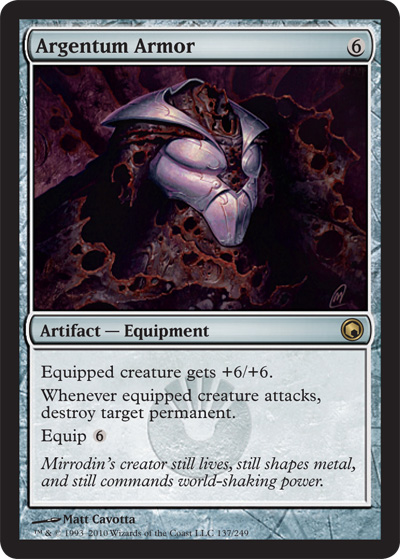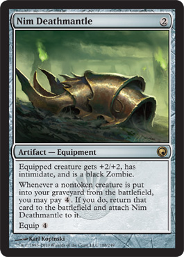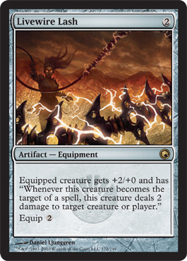 Whenever equipped creature deals combat damage to a player, you put a 2/2 green wolf token onto the battlefield and that player puts the top 10 cards of his or her library into his or her graveyard.