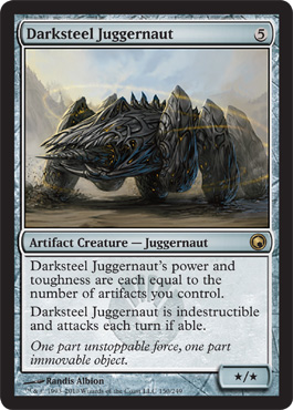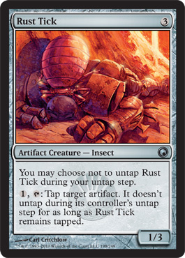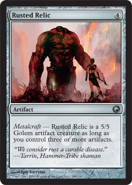 Metalcraft - Rusted Relic is a 5/5 Golem artifact creature as long as you control 3 or more artifacts.
