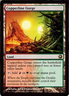 Copperline Gorge enters the battlefield tapped unless you control two or fewer other lands.