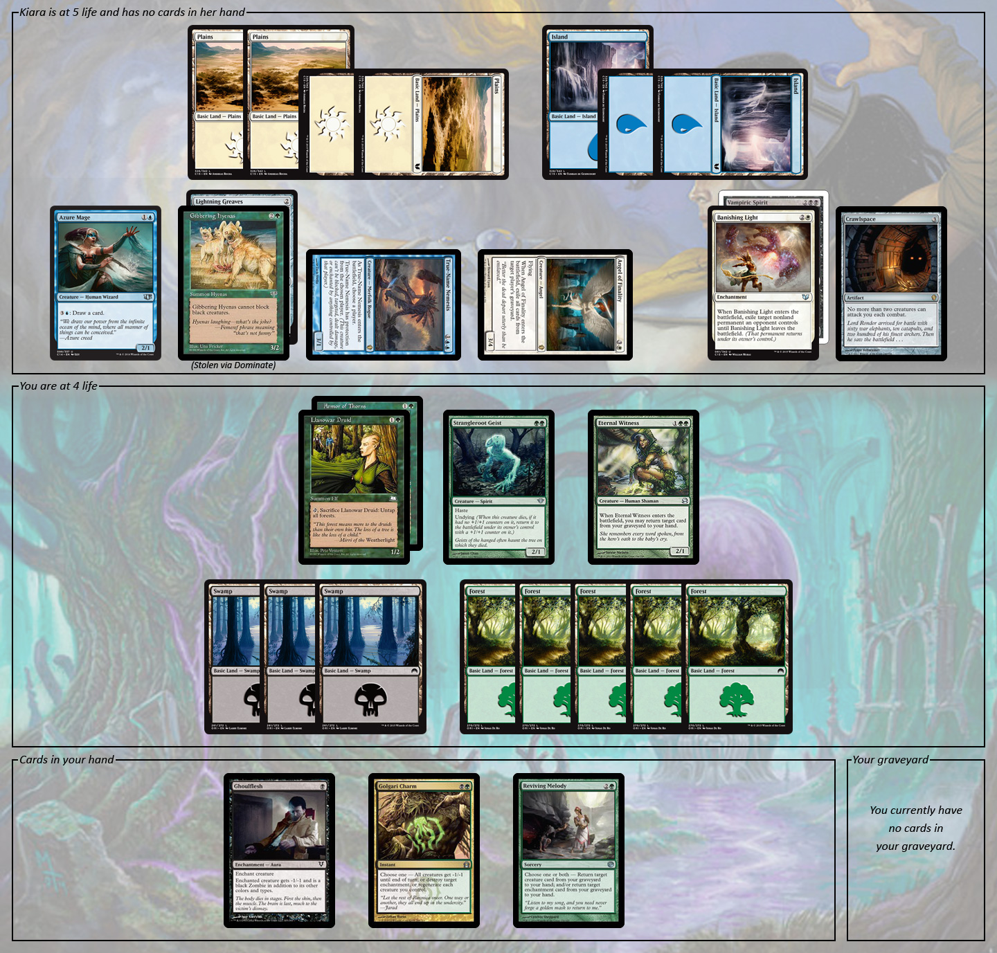 You have not yet played a land this turn. You do not know the identity of any of the cards that are currently on top of your library. You currently have no cards in your graveyard due to Kiara’s Angel of Finality.