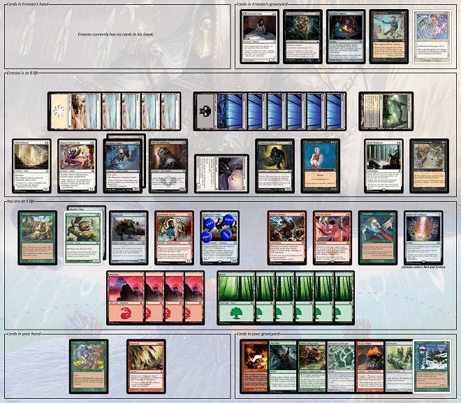 Ernesto is at 8 life and has no cards in his hand. He has the following cards in play: