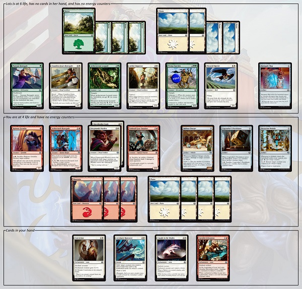 You don’t answer her, mostly because you weren’t expecting your games to be easy in the first place. After all, you’re playing Lois in the second round of your local game store’s Kaladesh draft, with a slight twist: With a shortage of stock in your area, you’re using one pack of Aether Revolt and two packs of Kaladesh today.