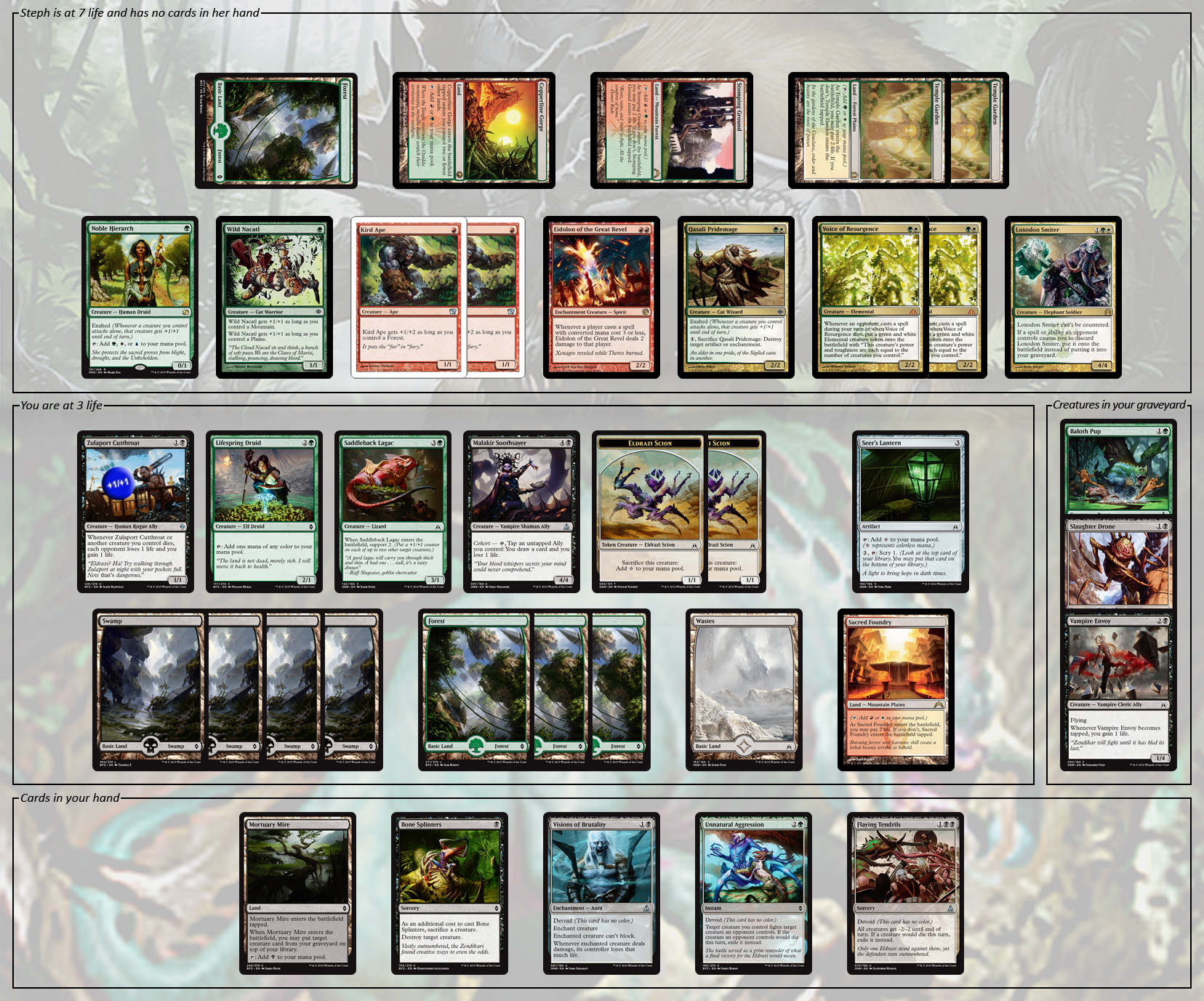 Steph is at 7 life and has no cards in her hand. She has the following cards in play: