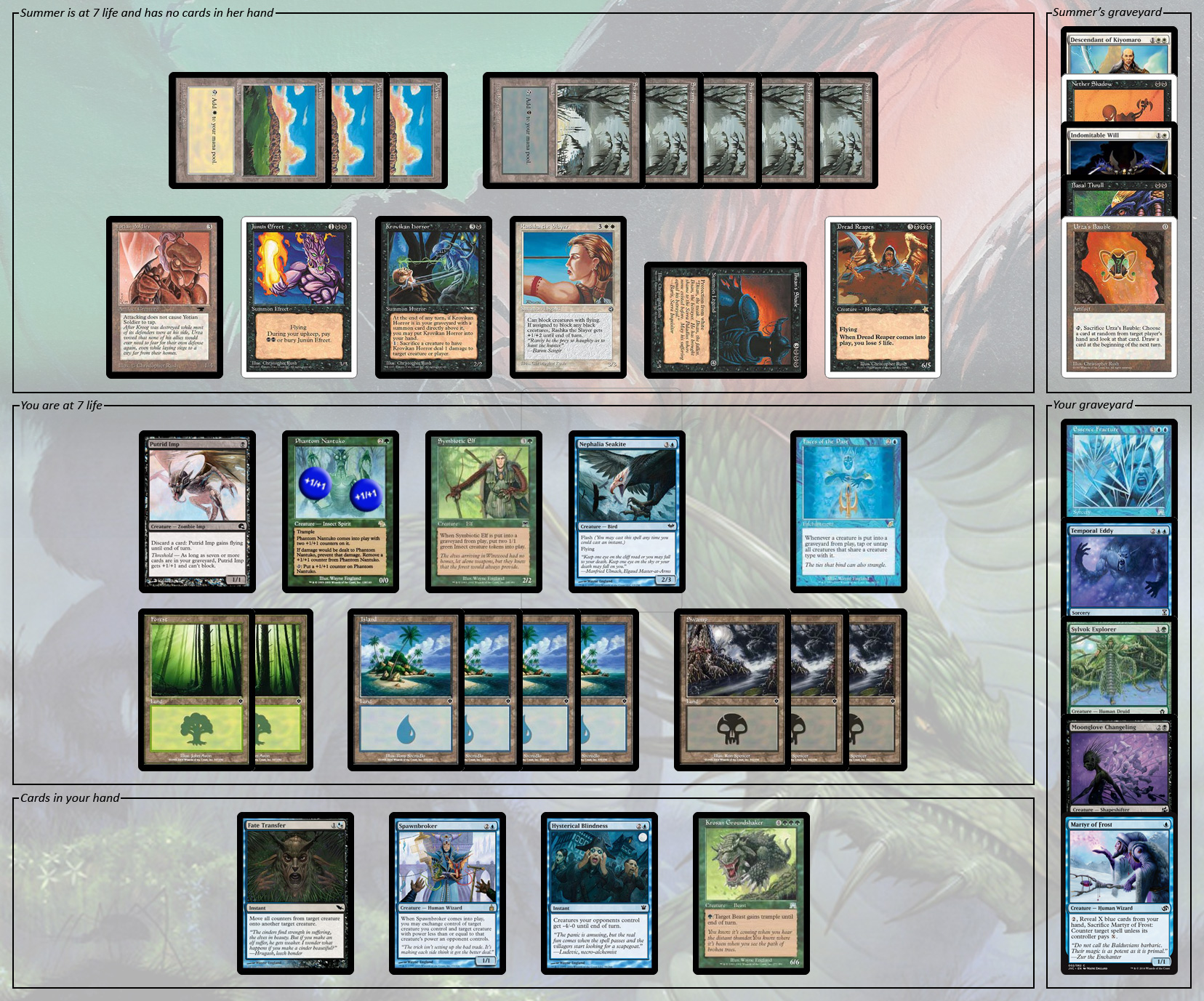 Summer is at 7 life and has no cards in her hand. She has the following cards in play: