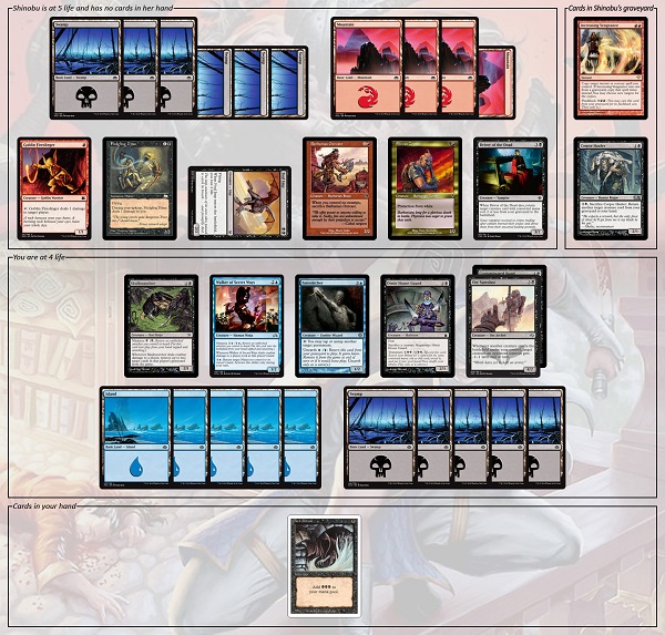 With no cards in hand, you’re banking on your draw phase to help set things right. However, the Dark Ritual on the top of your deck isn’t what you had in mind. Still, maybe there’s a way you can pull out a win that’s as stealthy as Shinobu’s Perilous Vault stunt; she’s only at 5 life, after all.