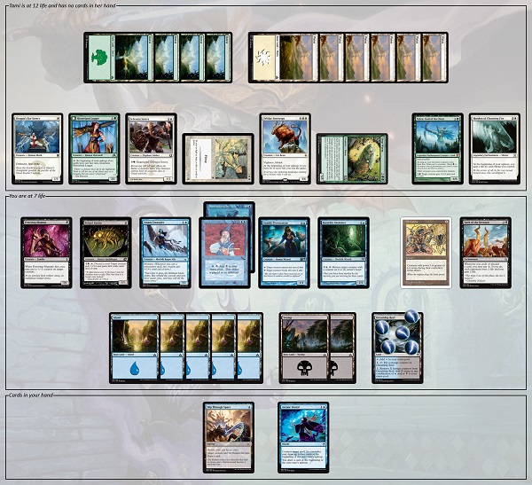 "Still, with at least 10 mana available -- and probably more -- for us after the Browbeat, giving us the extra cards was almost certainly a mistake. Sure, the two Red cards in our hand are already enough to wreck the opponent's board, but it takes the three Green cards and some creative thinking to turn the big play into a full wipe and a clean win."