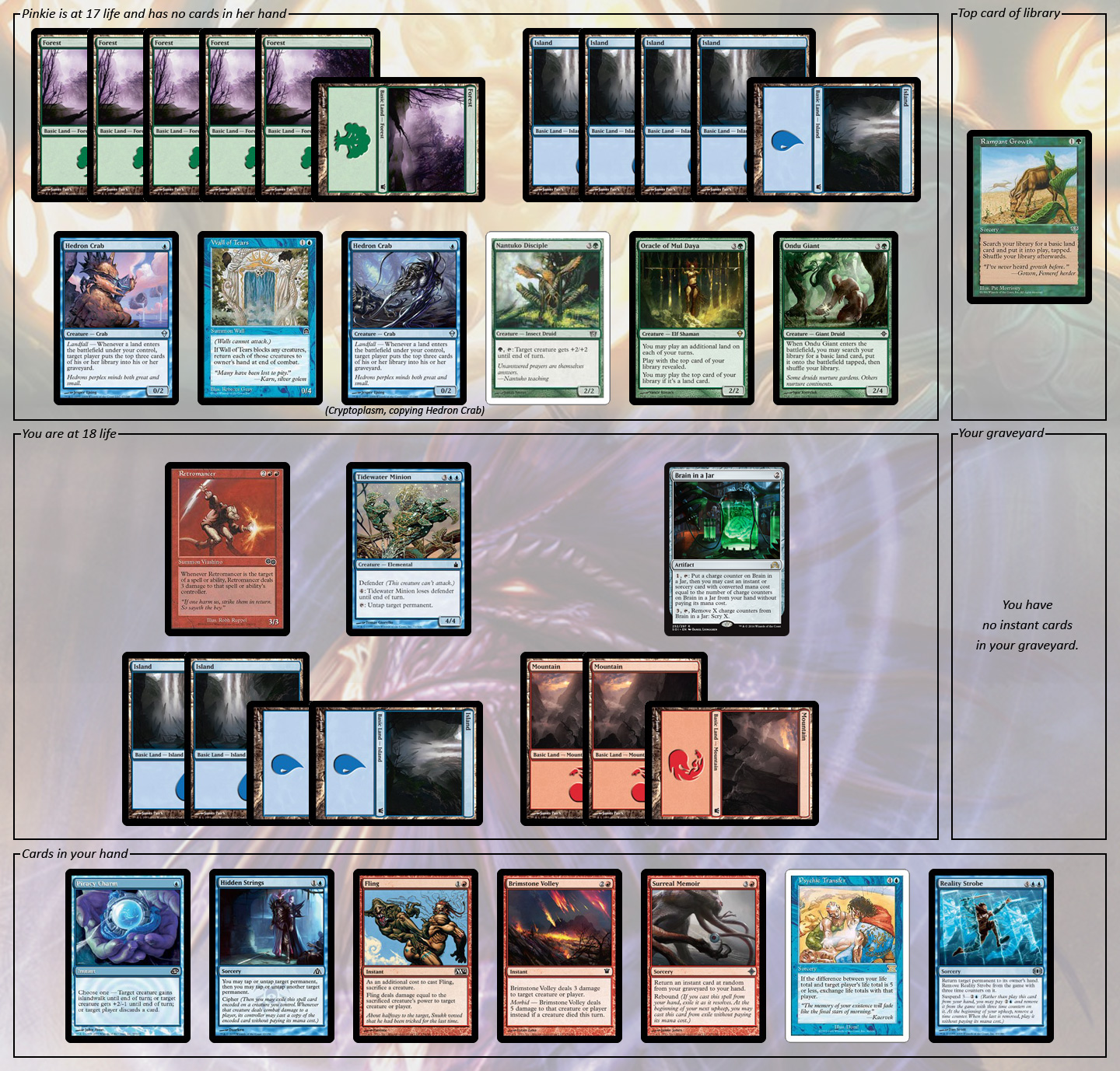 Surprisingly, Pinkie doesn’t recast her Forced Fruition. Instead, she has her Cryptoplasm copy her Hedron Crab, casts Rites of Spring to pitch both cards in her hand for two lands, and plays both of them to mill you for twelve! You’re still alive, mind you, but with three cards remaining in your library, you’re not going to be in this game for much longer.