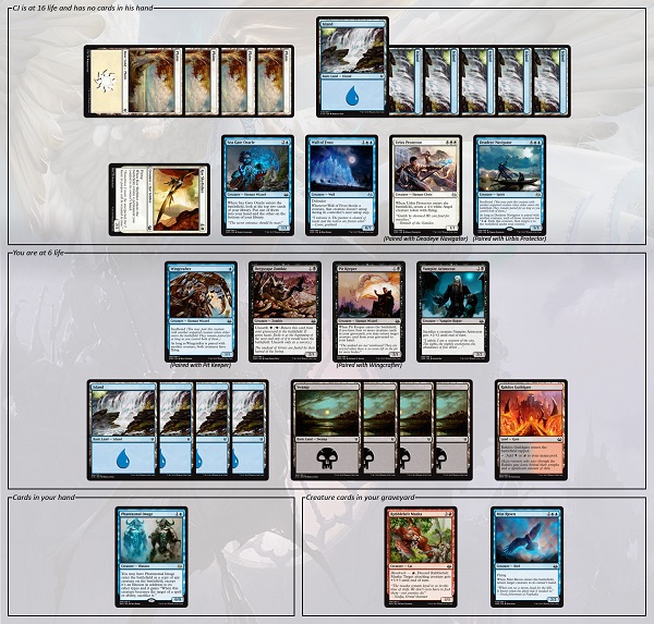 “Okay,” CJ says. “Second main phase. I’ll tap three to cast Sea Gate Oracle. It enters the battlefield, and I get to choose one of the top two cards of my library.”