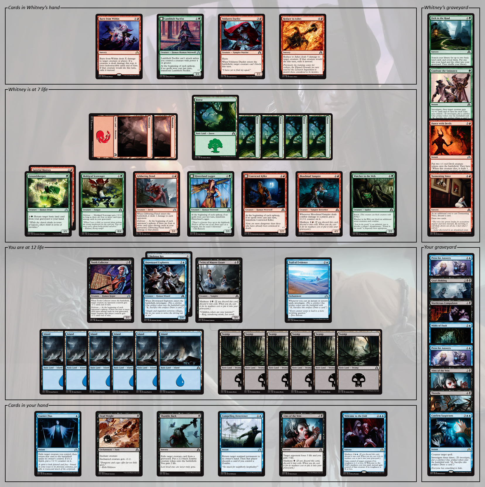 “You seemed worried about my Burn from Within, so you sacrificed the Clue tokens that you made from that 5-mana counterspell you played . . . ”