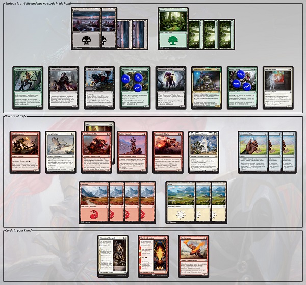 And while you're processing all this, Enrique sighs, pays five mana to cast a kicked Untamed Kavu, and then ends his turn. "There's no way I'm getting past your board and killing you from 8 life," he admits.