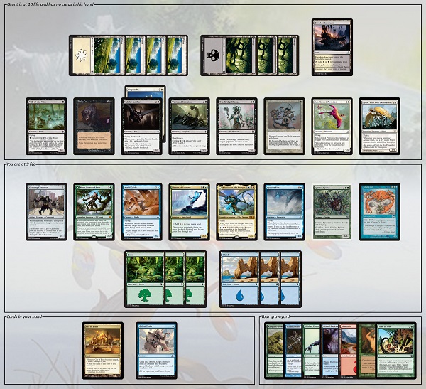 Your opponent, Grant, doesn't say anything. He's obviously not the chatty type, but part of you thinks that you might have turned him off with all your talk of how your local game store's Unabridged Cube has a mind of its own. However, you can't think of any other explanation of why things are what they are right now.