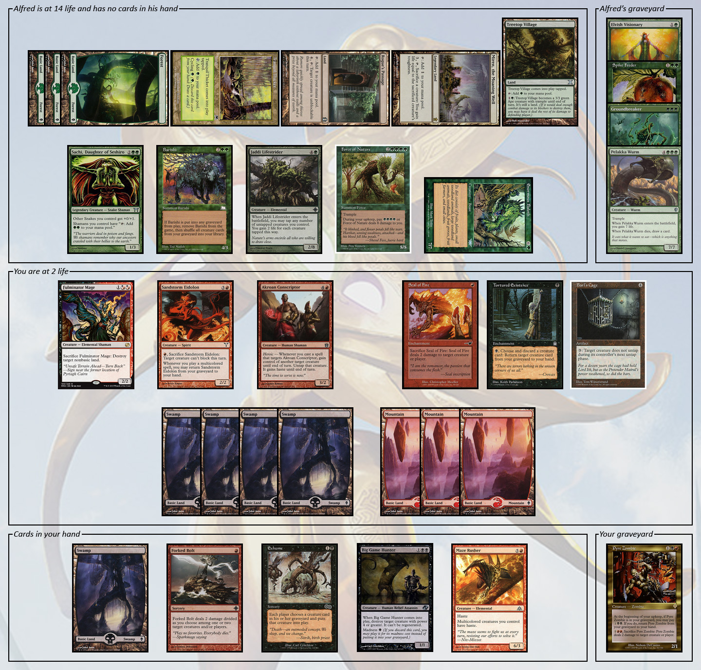 Alfred is at 14 life, has no cards in his hand, and has the following cards in play: