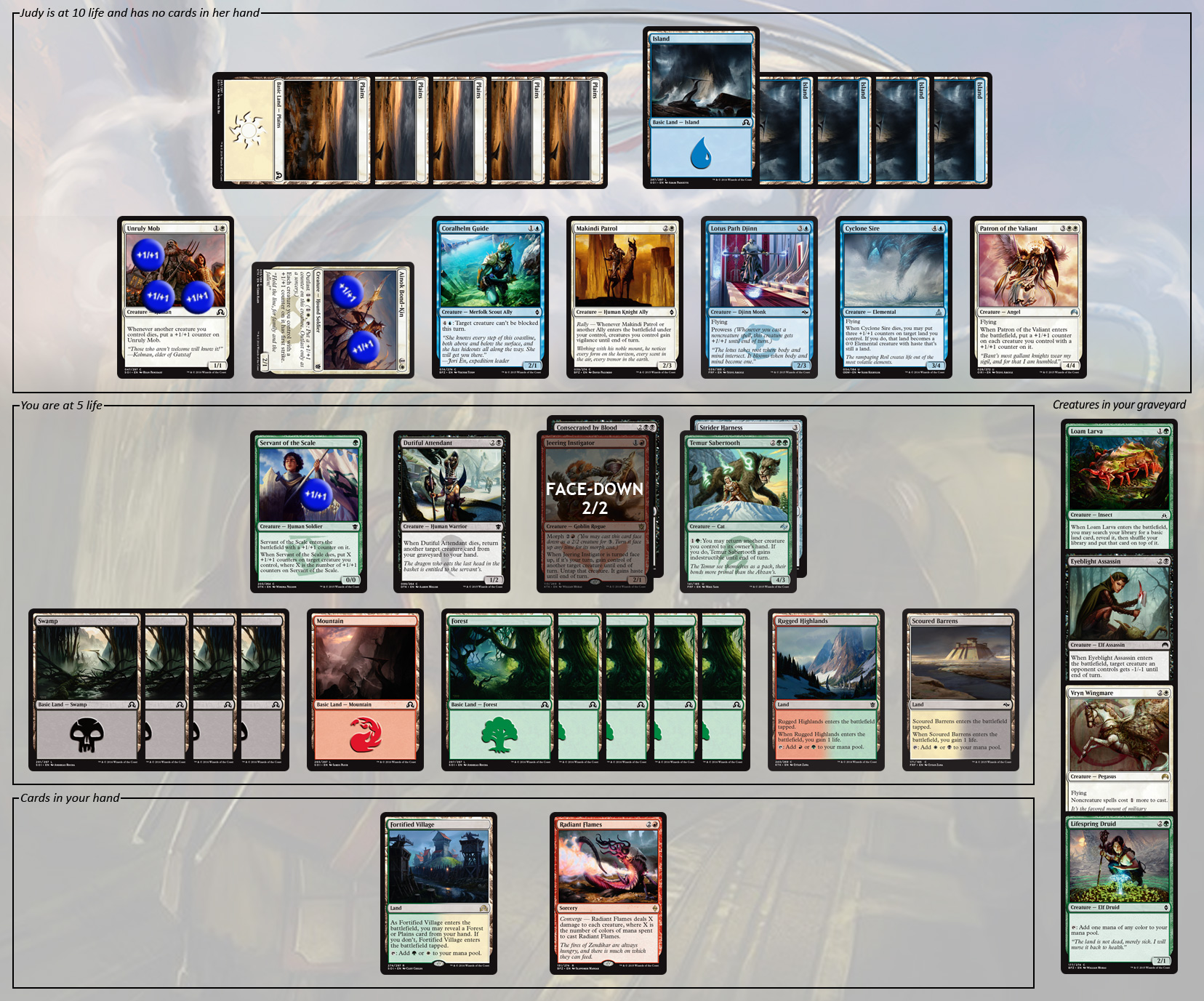 In hindsight, maybe you shouldn’t have waited too long to cast the Radiant Flames in your hand. Now that Judy’s rocking more than a few 4-toughness creatures, its usefulness has gone down a notch. All the same, however, it appears you might have to cast it to survive.