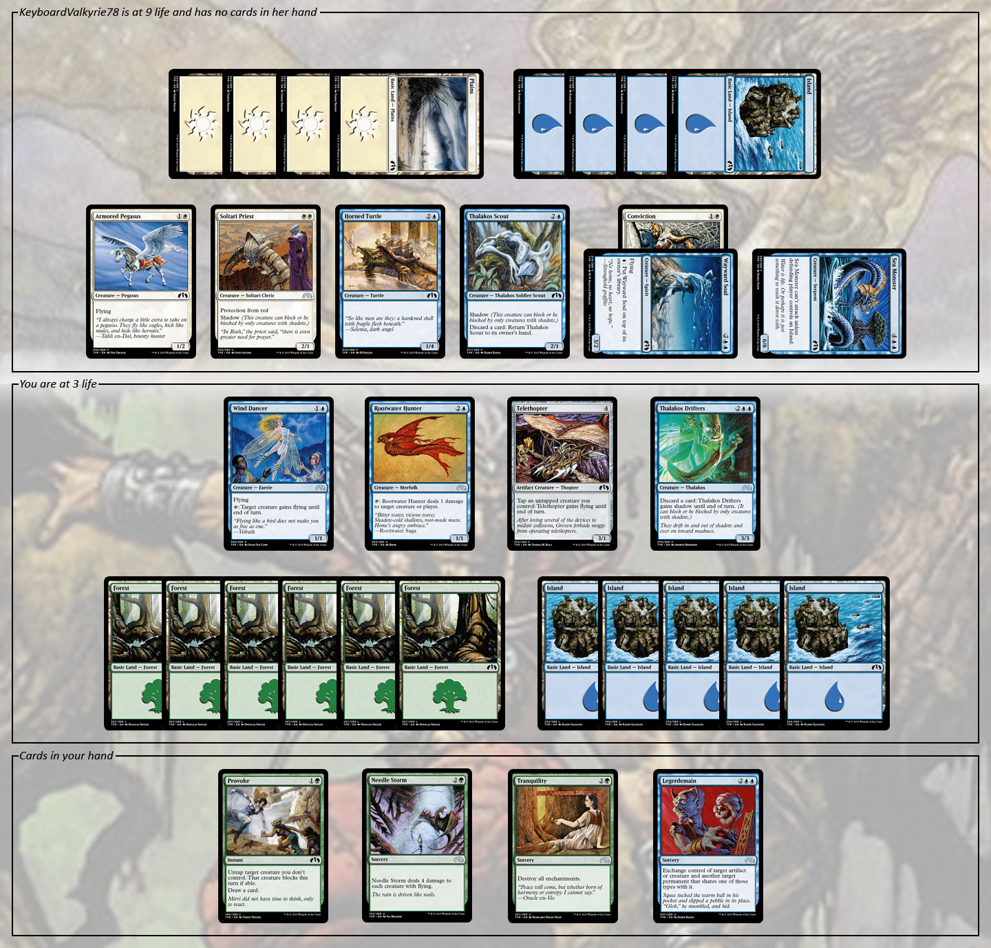 “In our third game, my opponent played a Sea Monster against me, which stopped me from attacking. Fortunately, I had a few creatures that could block: a Spined Wurm against the Sea Monster and a Thalakos Drifters against her shadow creatures.”