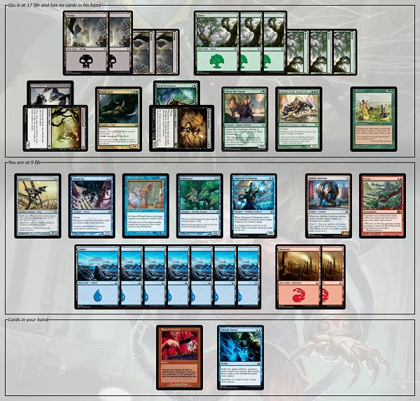 Qiu is at 17 life and has no cards in his hand. He has the following cards in play: