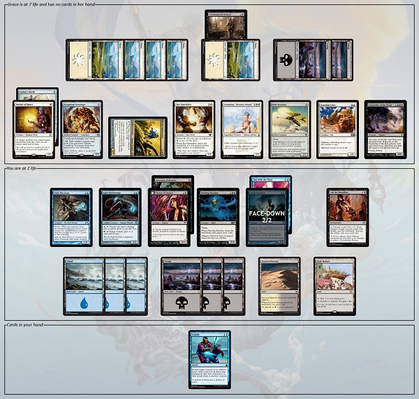 Grace is at 7 life and has no cards in her hand. She has the following cards in play: