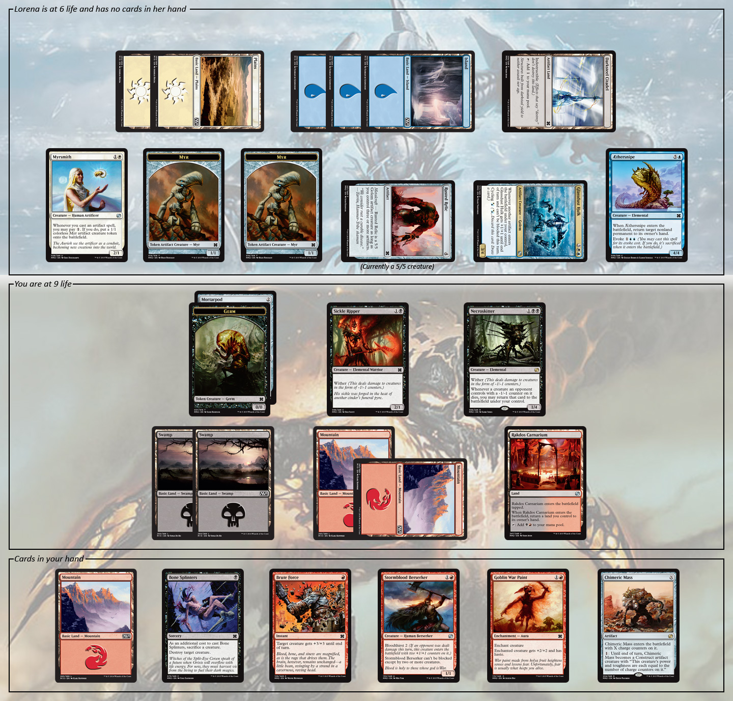 The turn after Lorena tapped out to cast her Aethersnipe (sending your Chimeric Mass back to your hand), you decided to make your move. Your first order of business was to sacrifice your Culling Dais. Ending up with six cards against Lorena’s empty hand, you found yourself behind on board presence but well ahead on card advantage.