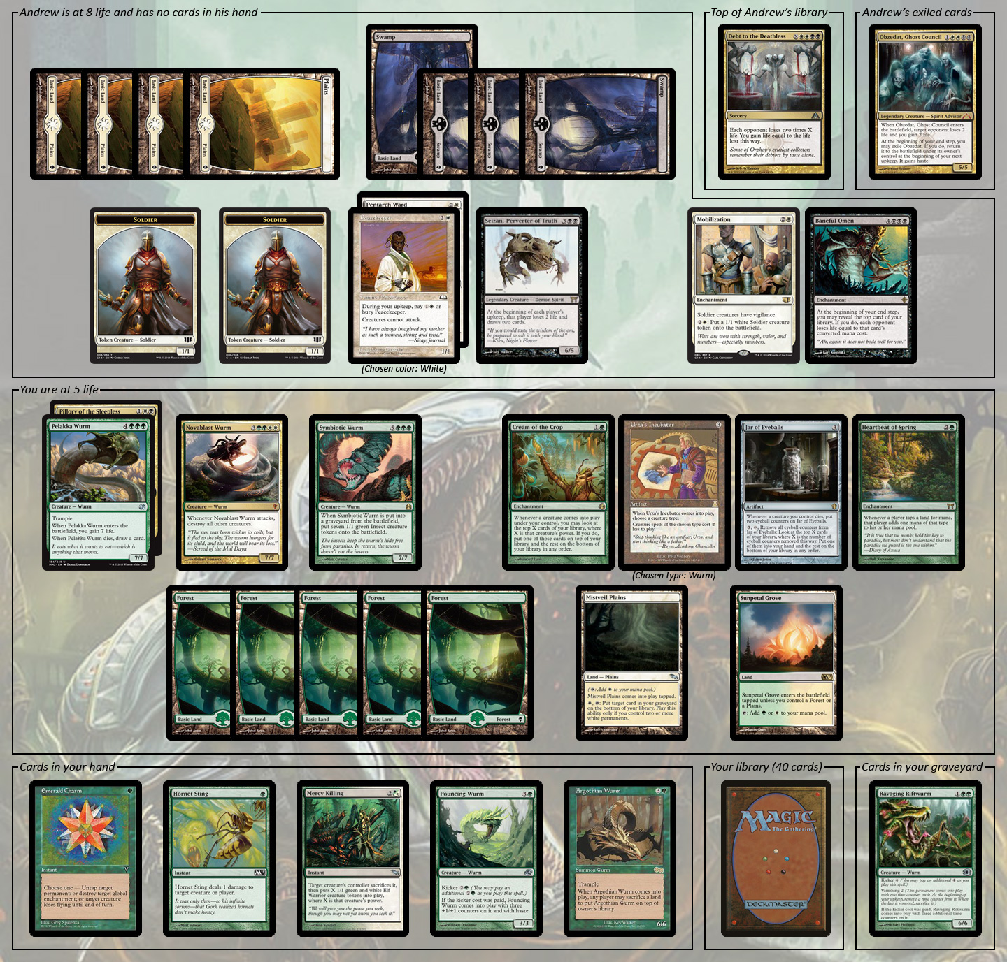 Thinking that the game is probably over, you let Seizan hit you for 2 more during your upkeep in exchange for a couple of additional cards. The Hornet Sting and the Mercy Killing were a complete surprise; you assumed that the Wurm deck didn’t have any removal at all. On top of that, your draw step gave you an Emerald Charm, which looks good against any of Andrew’s non-Aura enchantments.