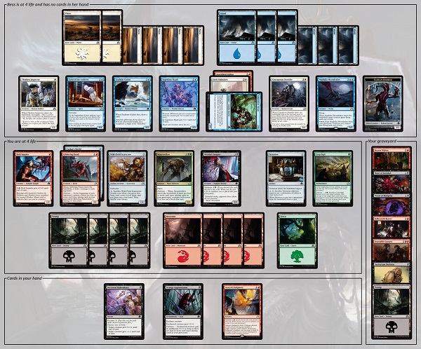 Bess is at 4 life and has no cards in her hand. She has the following cards in play: