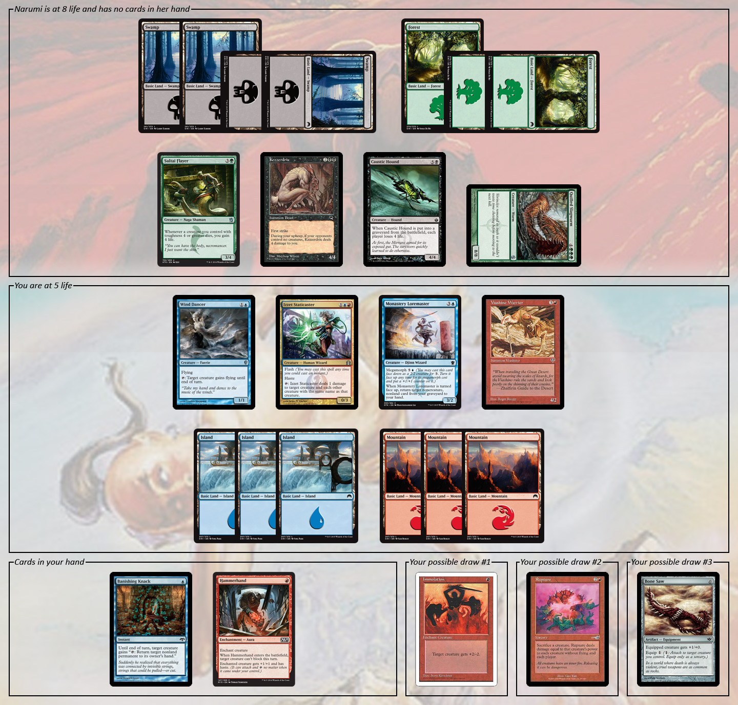 It is the middle of your draw step. The card that you draw this turn can be one of three different possibilities. For each of these three possible scenarios, defeat Narumi before the start of her next combat phase.