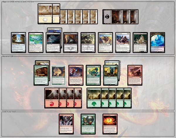 You glance back at your hand, which contains a few defensive cards you’ve been saving up. Biggs draws his card for the turn, and casually taps four mana.