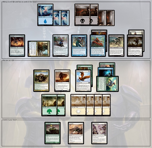 Mercy draws her card for the turn, which turns out to be just another Island. You start to sigh in relief, but then suddenly remember that she’s likely going to get a second card from her Shadowmage Infiltrator.