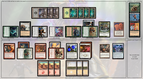 Rex is at 13 life and has no cards in his hand. He has the following cards in play: