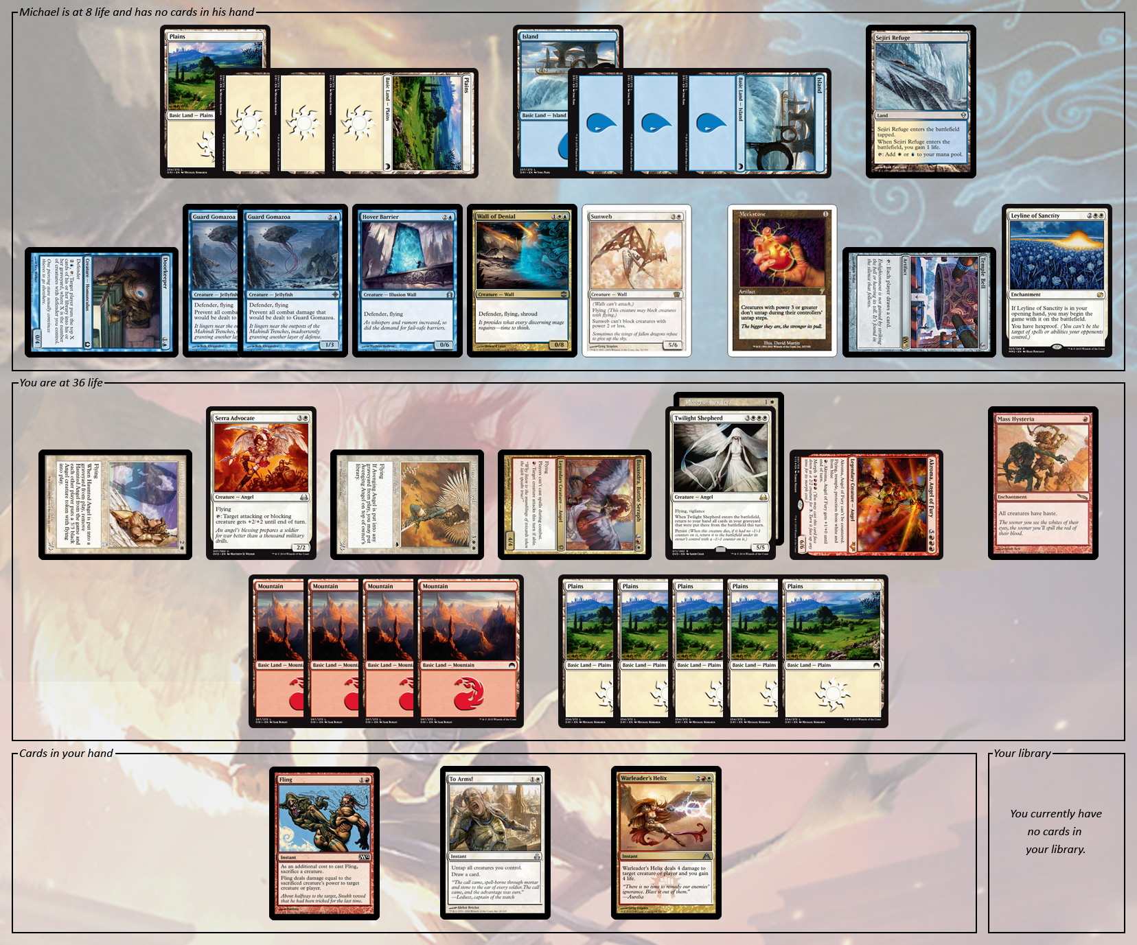 Your Angel-themed deck has been in fine form today, and when Michael sat across the table and challenged you to a game, you eagerly accepted. As you took your turns, it became obvious that Michael was piloting a deck based on the defender ability. Once you realized this, you saw no reason to hold back on your attacks.